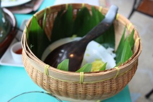 Now, onto the main courses and, wow, there were a lot! It was all served in this lazy susan turntable with a candle lit underneath it to keep the foods warm. There was also a beautifully carved decoration on the top. Now that I think about it, I can’t remember if it was a squash or papaya, but looking at the photo again I’m pretty sure it was papaya.