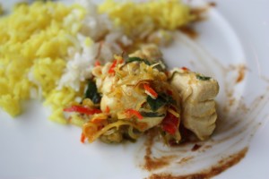 The main courses were served with rice from a bamboo steamer. Half was white rice and half was saffron yellow rice.