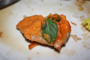 Next was the Lumpia Semarang from central Java. This deep fried spring roll included shrimp, bamboo shoots and fermented soy bean sauce. In this same picture to the right you will see the Empek-Empek Palembang from south Sumatra, a deep fried fish dumpling filled with egg and served with on sour palm sugar sauce blended with dried shrimp.