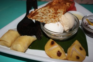 Tamarind and coconut cream ice cream. Then Kue Lumpur from Kalimantan, a sultanas (raisins) and young coconut pancake with vanilla and chocolate sauce followed by Dadar Gulung from all over Indonesia which was a banana crepe filled with coconut jam and pandan (tree leaf) sauce.